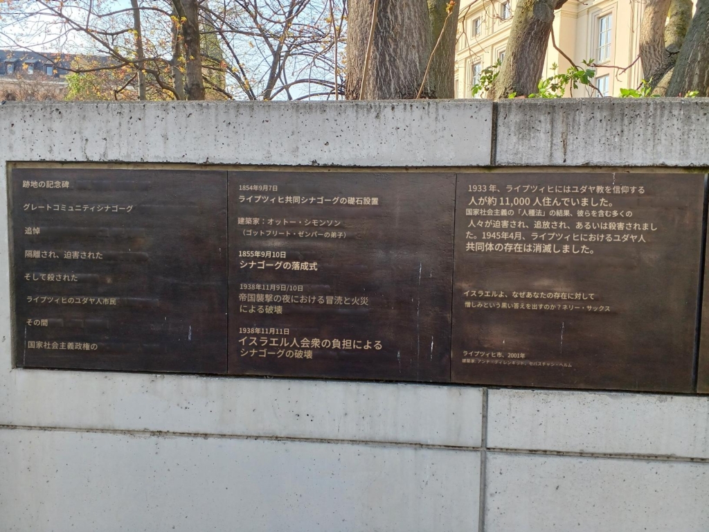 ここで、1938 年 11 月 9 日に、ライプツィヒのユダヤ教コミュニティの大きなシナゴーグ(ユダヤ教の会堂・礼拝所)がファシストの集団による放火によって破壊されました。