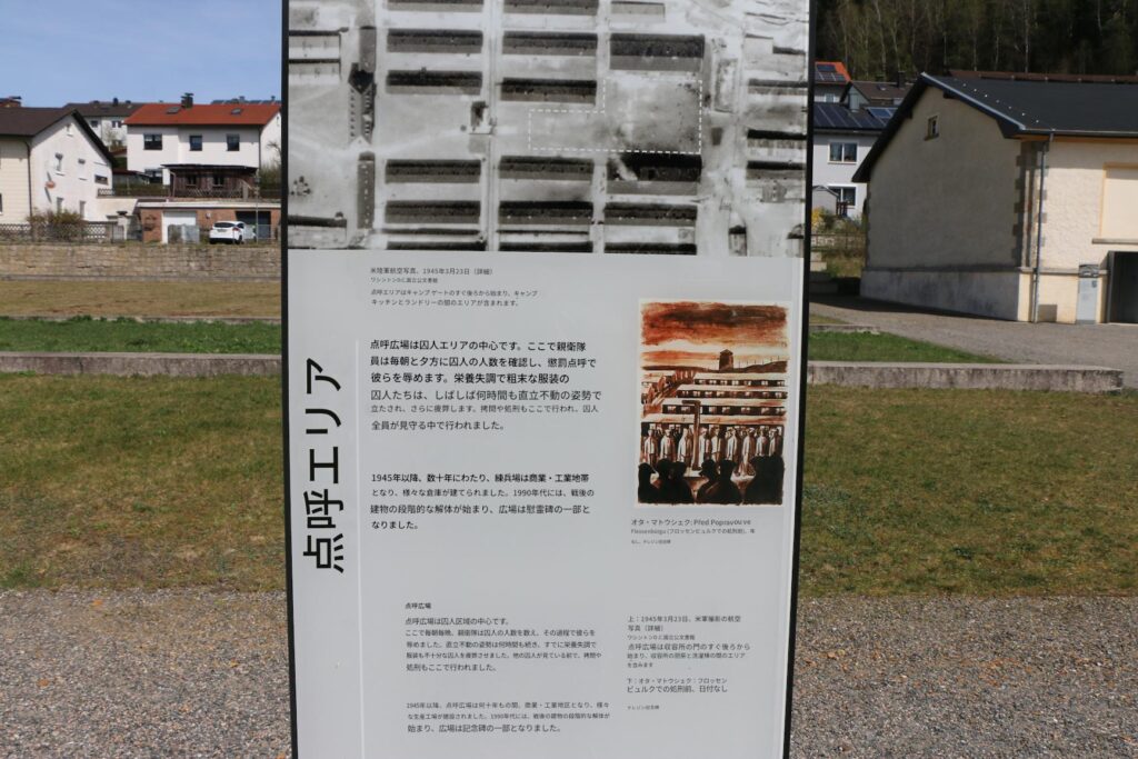 点呼広場 点呼広場は囚人区域の中心です。ここで、SSは毎朝毎晩、囚人の人数を数え、その過程で彼らを辱めました。直立不動の姿勢は何時間も続き、すでに栄養失調で服装も不十分な囚人を疲弊させました。拷問や処刑もここで行われ、他の囚人が見守るしかありませんでした。1945年以降、点呼広場は何十年もの間、商業・工業地区となり、様々な生産工場が建設されました。1990年代には、戦後の建物の段階的な解体が始まり、広場は記念碑の一部となりました。