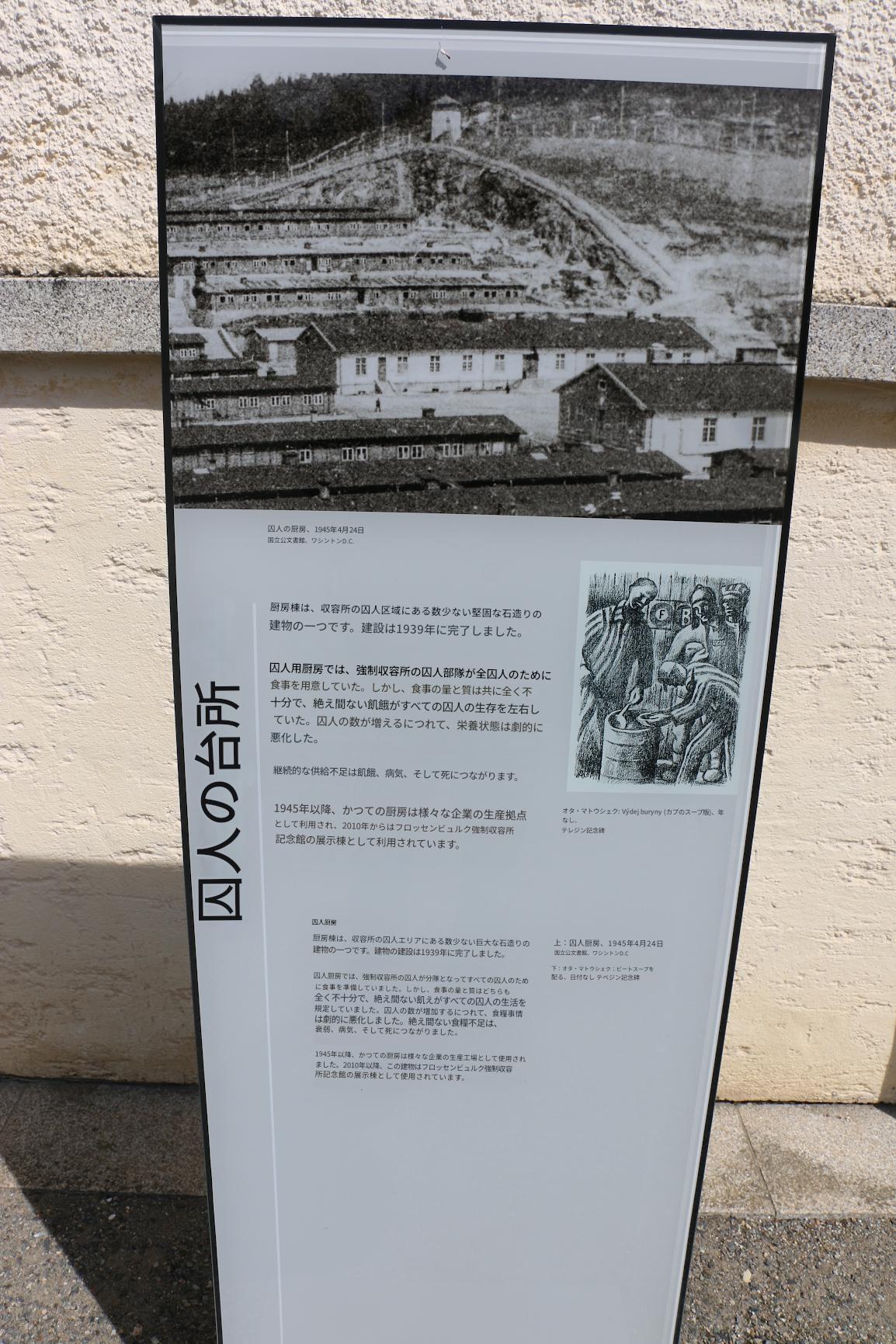 囚人の台所 厨房棟は、収容所の囚人区域にある数少ない堅固な石造りの建物の一つで、1939年に建設が完了しました。囚人用の厨房では、強制収容所の囚人作業班が全囚人のために食事を用意している。しかし、食事の量と質は共に全く不十分で、絶え間ない飢えがすべての囚人の生存を規定している。囚人の数が増えるにつれて、食糧事情は劇的に悪化する。栄養不足が続くと、衰弱、病気、そして死につながります。1945年以降、かつての厨房は様々な企業の生産拠点として利用され、2010年からはフロッセンビュルク強制収容所記念館の展示棟として利用されています。