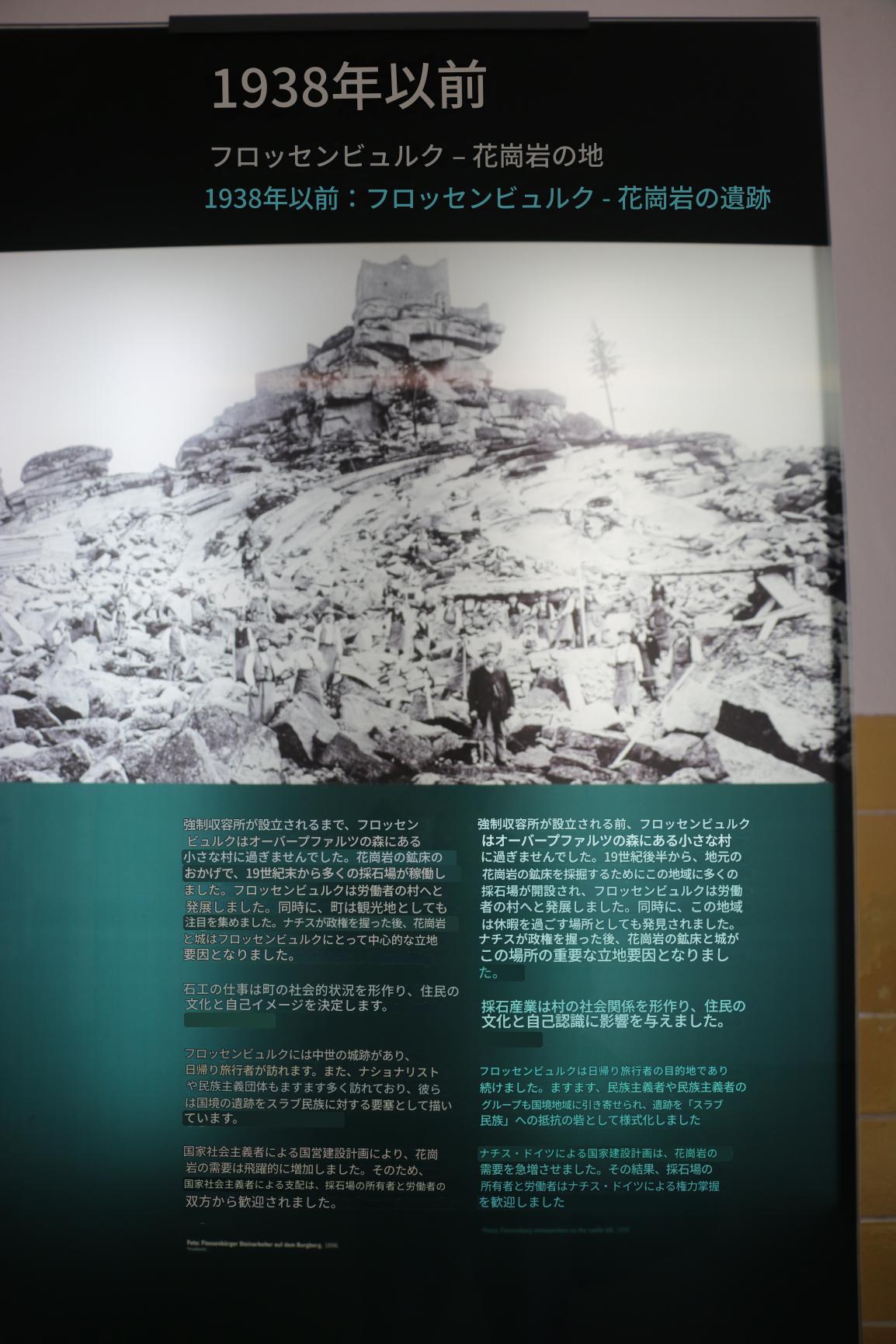 1938年以前 フロッセンビュルク – 花崗岩の地 強制収容所が設立される前、フロッセンビュルクはオーバープファルツの森にある小さな村に過ぎませんでした。19世紀後半から、地元の花崗岩の鉱床を採掘するためにこの地域に多くの採石場が開設され、フロッセンビュルクは労働者の村へと発展しました。同時に、この地域は休暇を過ごす場所としても発見されました。ナチスが政権を握った後、花崗岩の鉱床と城がこの場所の重要な立地要因となりました。