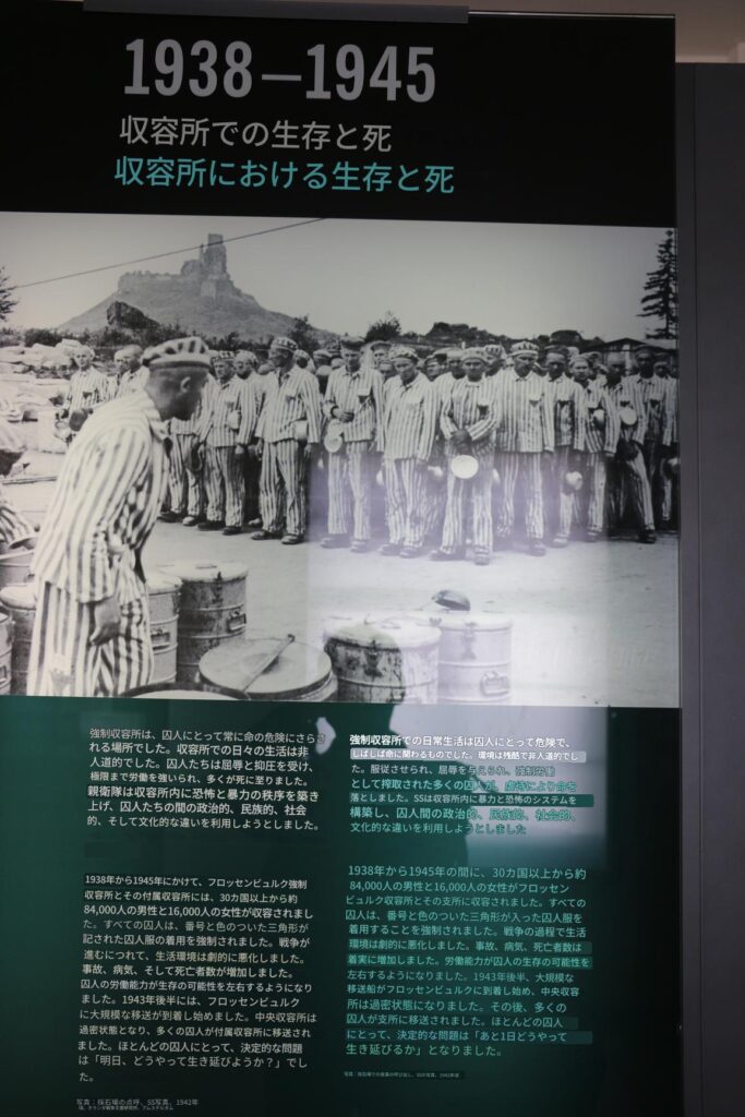 強制収容所は、囚人にとって常に命の危険にさらされる場所でした。収容所での日々の生活は非人道的でした。囚人たちは屈辱と抑圧を受け、極限まで労働を強いられ、多くが死に至りました。親衛隊は収容所内に恐怖と暴力の秩序を築き上げ、囚人たちの間の政治的、民族的、社会的、そして文化的な違いを利用しようとしました。