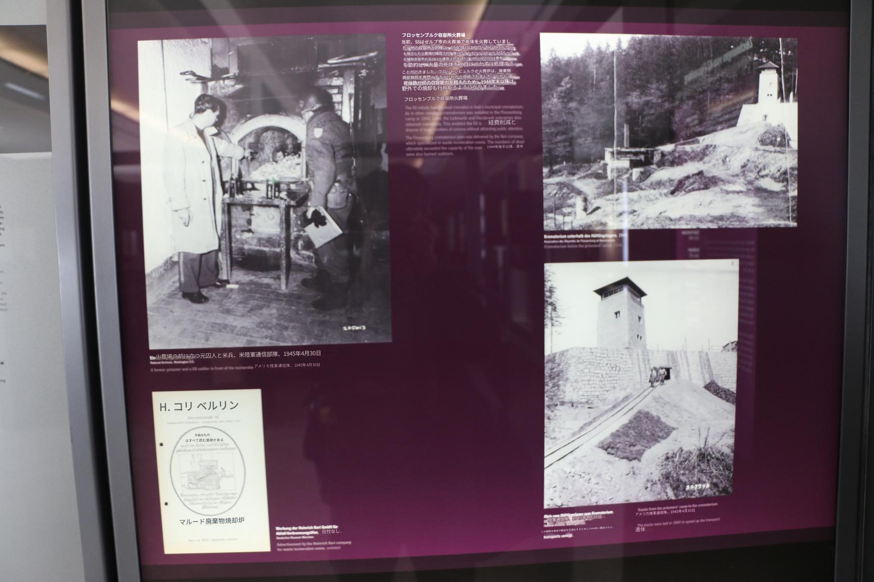 フロッセンブルク収容所火葬場 当初、SSはゼルプ市の火葬場で死体を火葬していました。他の収容所と同様に、1940年にはフロッセンビュルクにも独立した火葬場が建設され、後にライトメリッツとヘルスブルックの補助収容所の近くにも建設されました。これによりSSは費用を節約し、大量の死体を人目につかずに処理することができました。フロッセンビュルクの火葬炉は、廃棄物焼却施設を専門とするコリ社から供給されました。しかし、死体数が炉の収容能力を超えたため、1944年末以降は野外での焼却も行われるようになりました。火葬場の前に立つ元囚人と米兵、米陸軍通信部隊、1945年4月30日