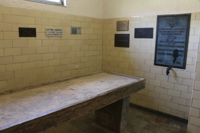 左、中は火葬場建物内、右 収容所の門と火葬場 1946年という早い時期に、フロッセンビュルクに住む、主にポーランド出身のナチス迫害の犠牲者たちは、強制収容所の犠牲者のための記念碑を建てました。かつての収容所の門と収容所のフェンスの一部が記念碑への入り口として使用されました。刑務所の火葬場は記念碑の次の部分を形成していました。1940年に建設されたこの建物には、解剖室と、着実に増加する犠牲者の遺体を焼却するための焼却炉が含まれていました。収容所の門と火葬場は、囚人の運命の始まりと終わりの象徴です。