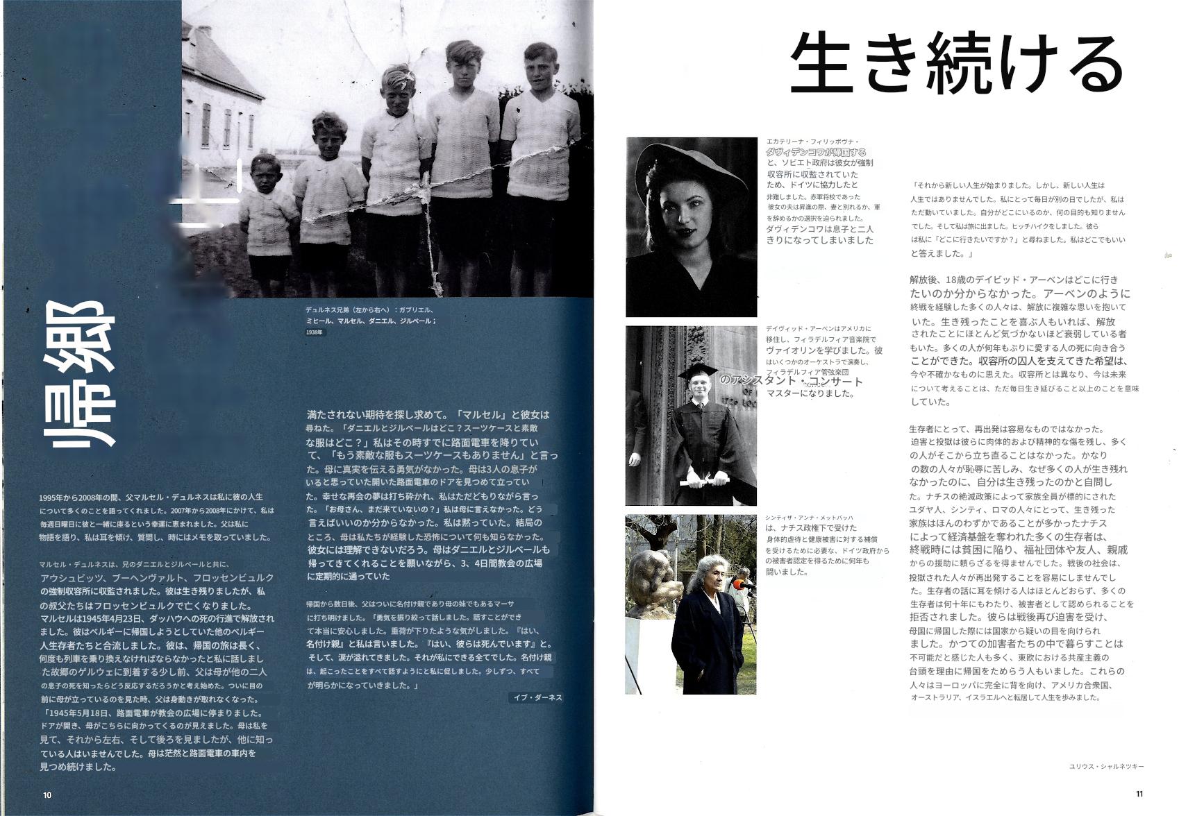 左)生存者にとって、再出発は容易なものではなかった。迫害と投獄は彼らに肉体的および精神的な傷を残し、多くの人がそこから立ち直ることはなかった。かなりの数の人々が恥辱に苦しみ、なぜ多くの人が生き残れなかったのに、自分は生き残ったのかと自問した。ナチスの絶滅政策によって家族全員が標的にされたユダヤ人、シンティ、ロマの人々にとって、生き残った家族はほんのわずかであることが多かった。ナチスによって経済基盤を奪われた多くの生存者は、終戦時には貧困に陥り、福祉団体や友人、親戚からの援助に頼らざるを得ませんでした。(略)かつての加害者たちの中で暮らすことは不可能だと感じた人も多く、東欧における共産主義の台頭を理由に帰国をためらう人もいました。これらの人々はヨーロッパに完全に背を向け、アメリカ合衆国、オーストラリア、イスラエルへと転居して人生を歩みました。