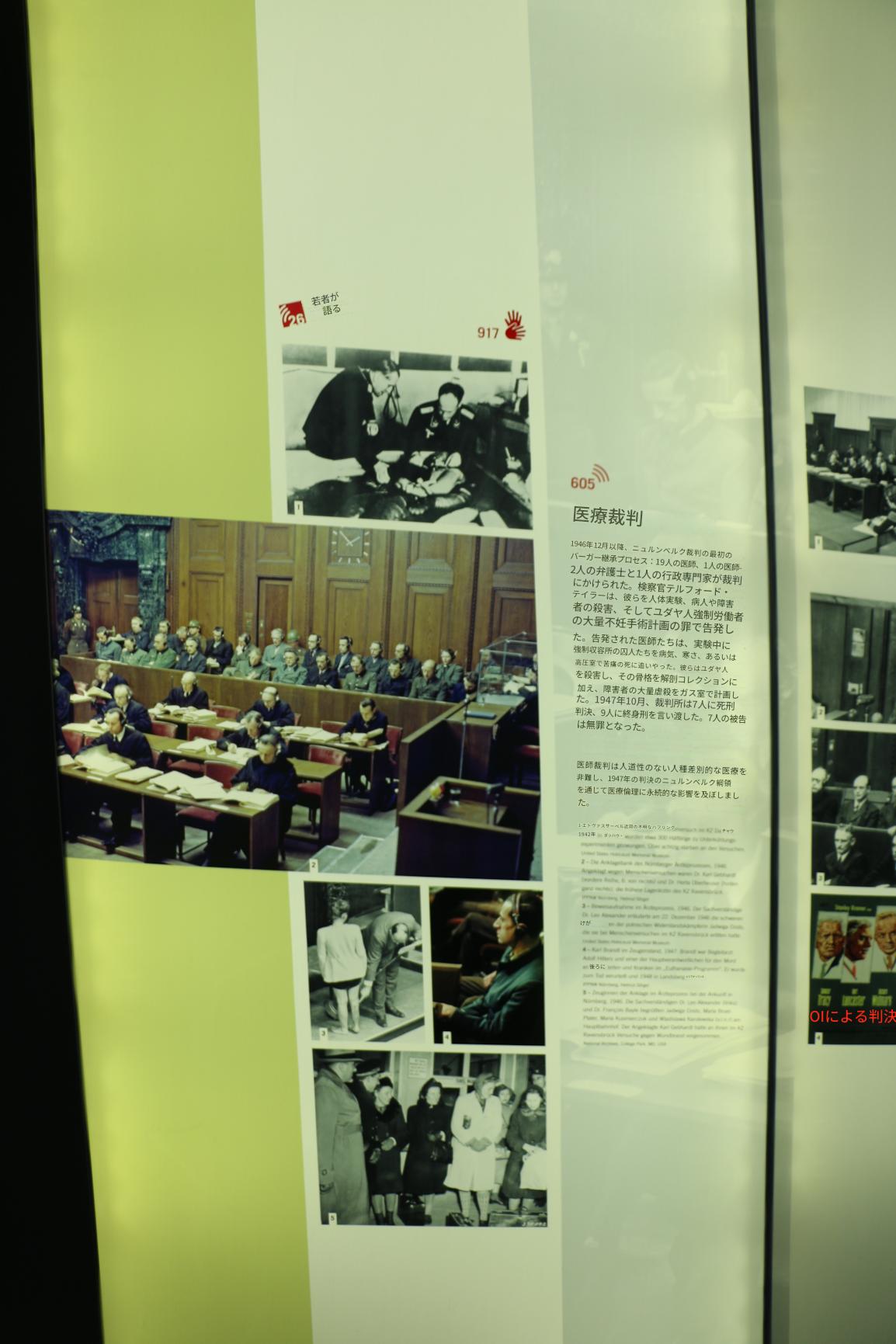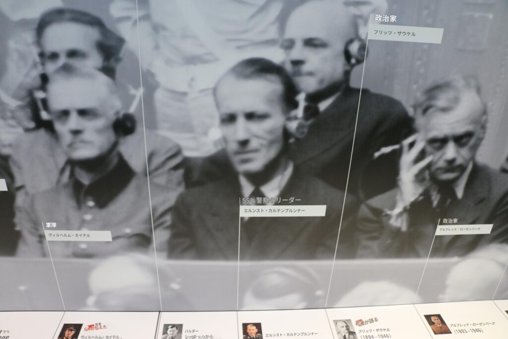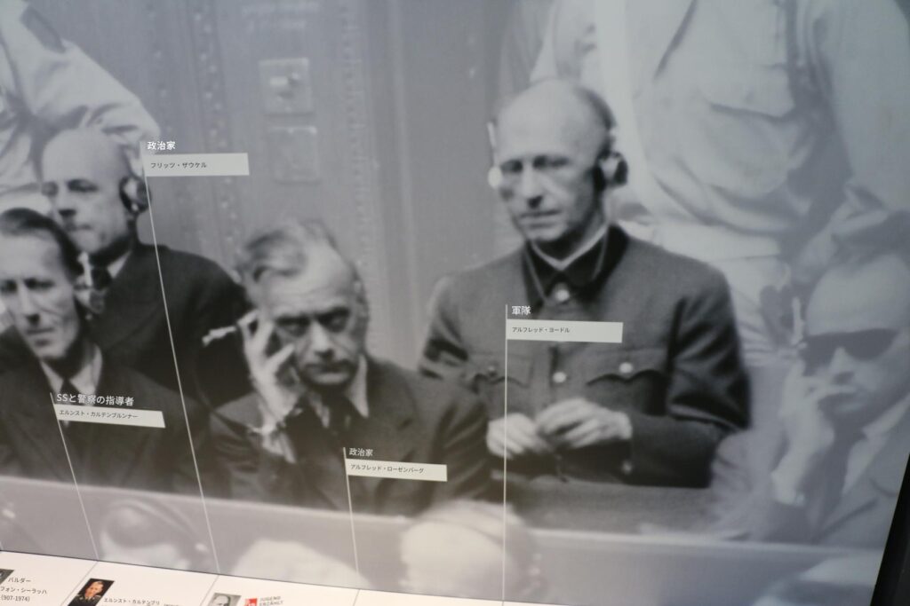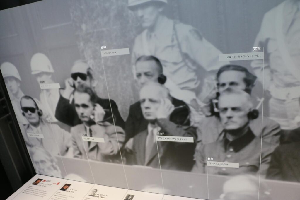 ニュルンベルク裁判メモリアルの常設展示では、裁判に至るまでの歴史、その経過、そしてその影響に関する情報を提供しています。裁判に関わった最も重要な人物を紹介し、多数の文書、音声、映像を展示しています