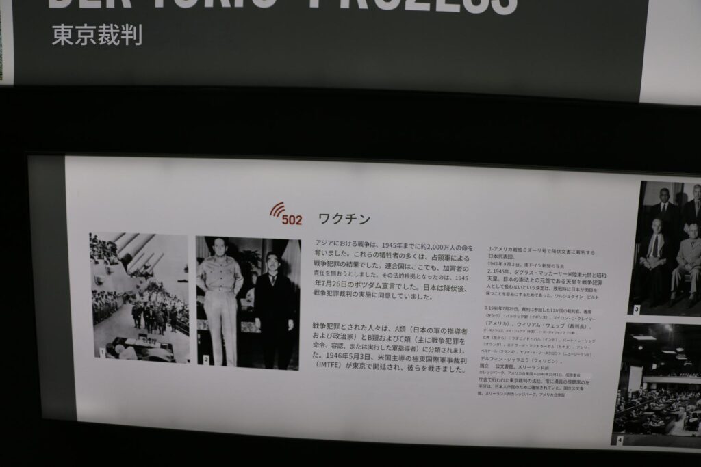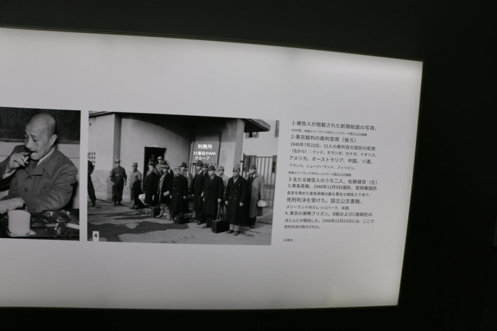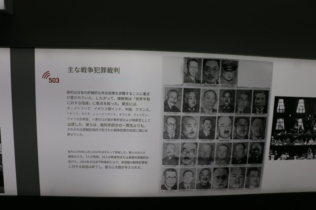 東京裁判も詳細に展示されていたのが印象に残った。法廷の上の階の展示を見る前にニュルンベルク裁判のドキュメント映像を上映しますと案内されていたが、満員で入れなかったのが残念であった。市ヶ谷の防衛省内にある東京裁判市ヶ谷法廷でも日本の戦犯の展示を詳細にしているのだろうか?