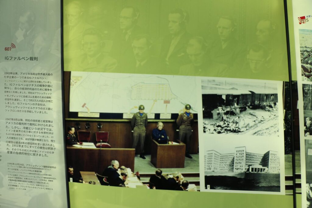 1943年以来、アメリカ当局は世界最大級の化学企業の一つであるIGファルベン・コングロマリットに関する資料を収集していました。IGファルベンはナチスの戦争計画に関与し、自らの経済的利益のために戦争を容赦なく利用しました。同社はアウシュヴィッツ=モノヴィッツに合成ゴム生産のための強制収容所を運営し、そこで約3万人の囚人が死亡しました。IGファルベンの子会社は、アウシュヴィッツ=ビルケナウのガス室にツィクロンBガスを供給していました。1947年8月以降、同社の技術者と経営陣はアメリカの裁判所で裁判にかけられました。しかし、冷戦という状況下では、ドイツ産業界の有力者に対する有罪判決はもはや政治情勢にそぐわなくなっていました。23人の被告のうち、ほぼ半数が無罪となり、残りの被告は最長8年の懲役刑を言い渡されました。1951年までにすべての被告は釈放され、そのうちの何人かは後にドイツの化学産業の指導的地位に就きました。