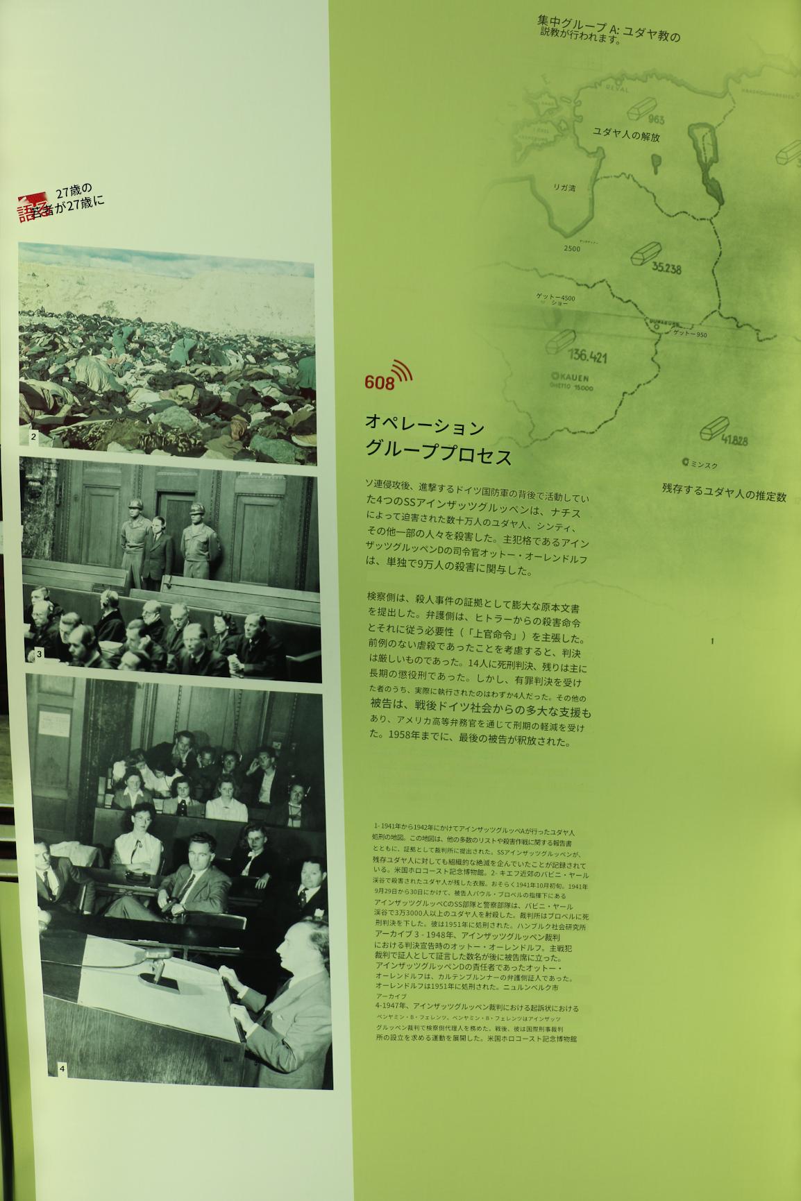 1- 1941年から1942年にかけてアインザッツグルッペAが行ったユダヤ人処刑の地図。この地図は、他の多数のリストや殺害作戦に関する報告書とともに、証拠として裁判所に提出された。SSアインザッツグルッペンが、残存ユダヤ人に対しても組織的な絶滅を企んでいたことが記録されている。米国ホロコースト記念博物館。