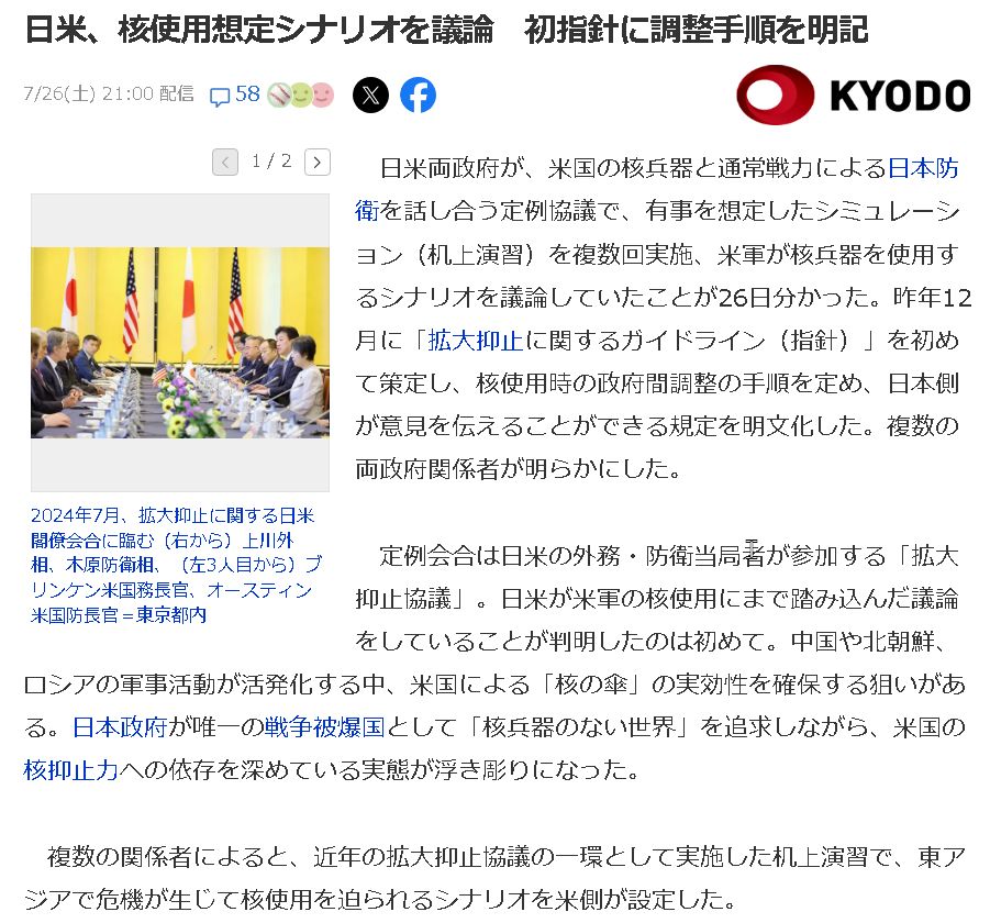 日米外務防衛当局者の拡大抑止協議の戦争机上演習で自衛隊が中国への核の脅しを再三求め米軍側が合意した。核戦争の準備段階に入った7月共同などが報道。