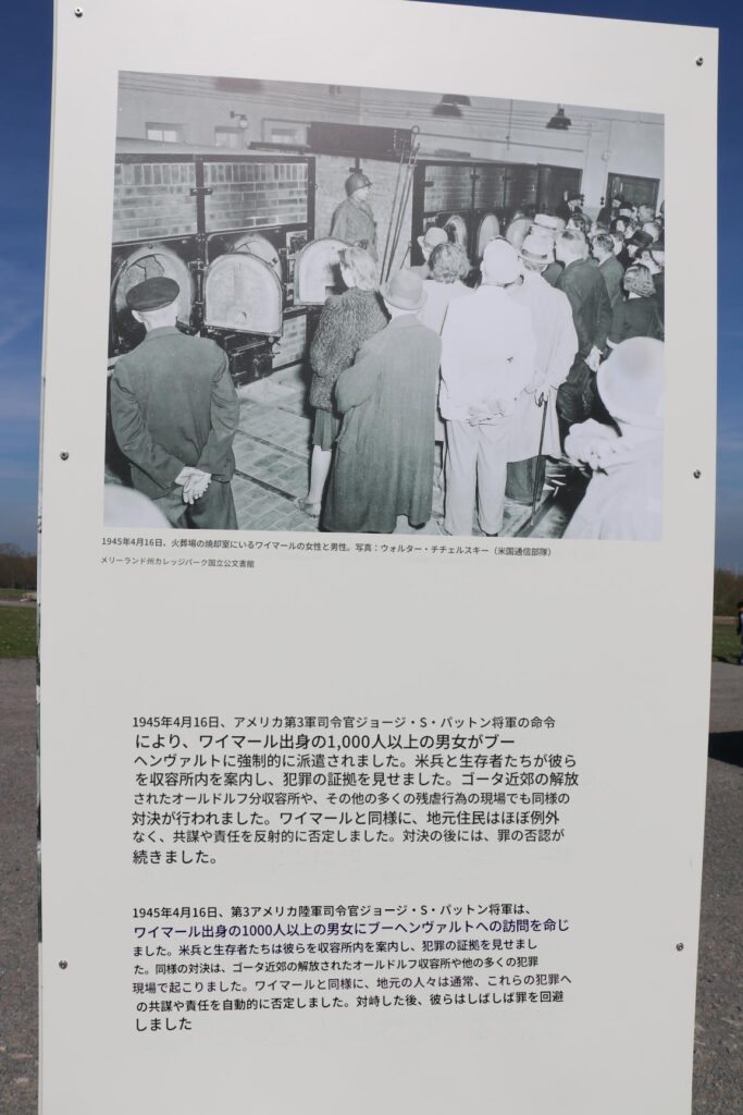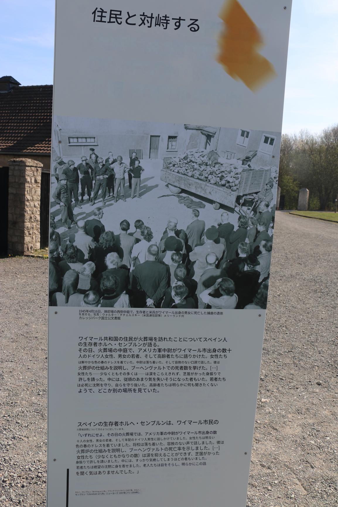「いずれにせよ、その日の火葬場では、アメリカ軍の中尉がワイマール市出身の数十人の女性、男女の若者、そして年配のドイツ人男性に話しかけていました。女性たちは明るい色の春のドレスを着ていました。将校は落ち着いた、容赦のない声で話しました。彼は火葬炉の仕組みを説明し、ブーヘンヴァルトの死亡率を示しました。女性たち(少なくともかなりの数)は涙を抑えることができず、芝居がかった身振りで許しを請いました。中には、すっかり気絶してしまうほどの者もいました。若者たちは絶望の沈黙に身を寄せました。老人たちは目をそらし、明らかにこの話を聞く気はありませんでした。」