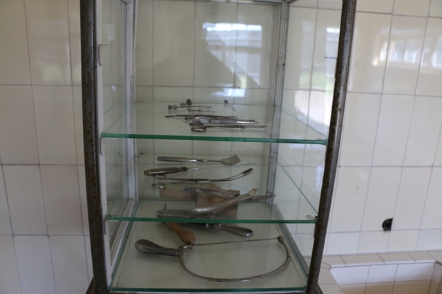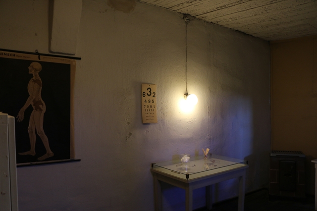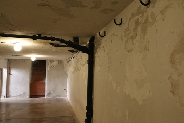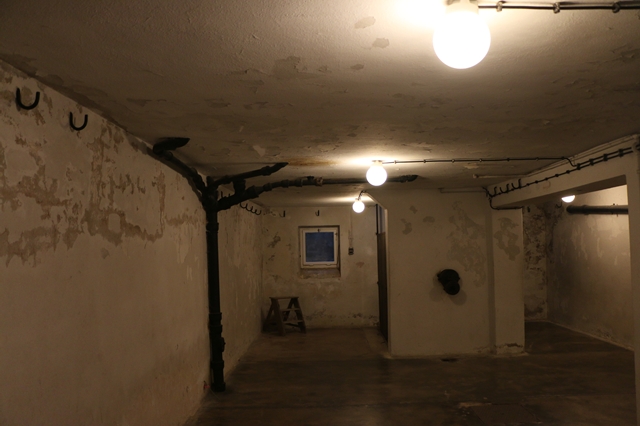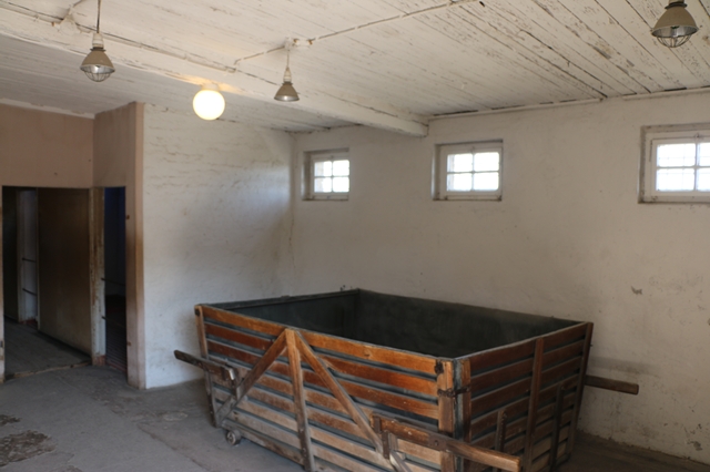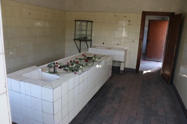 左:解剖台 右:1942年に建てられた遺体安置所、遺体はシュートから地下室に投げ込まれ、そこで集められ、エレベーターまで引きずられ、火葬室に運ばれた。SSは約1,100人の男女と若者を壁のフックで絞殺した。強制収容所の囚人や戦争捕虜に加え、主に外国人強制労働者であった民間人も、ゲシュタポ(秘密国家警察 )によって殺害のためにここに連れてこられた。