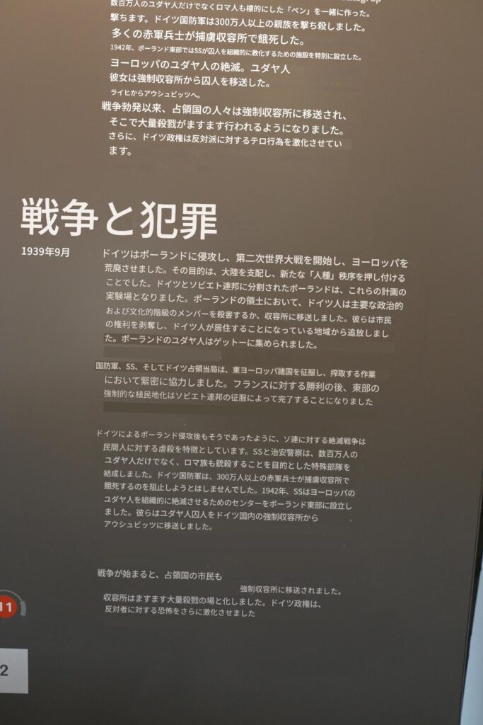 「戦争と犯罪」戦争勃発以来、占領国の人々も強制収容所に移送され、そこで大量殺戮がますます行われるようになっています。さらに、ドイツ政権は反対派に対するテロ行為を激化させています。1939年9月ドイツはポーランドに侵攻し、第二次世界大戦を開始し、ヨーロッパを荒廃させました。その目的は、大陸を支配し、新たな「人種」秩序を押し付けることでした。ドイツとソビエト連邦に分割されたポーランドは、これらの計画の実験場となりました。