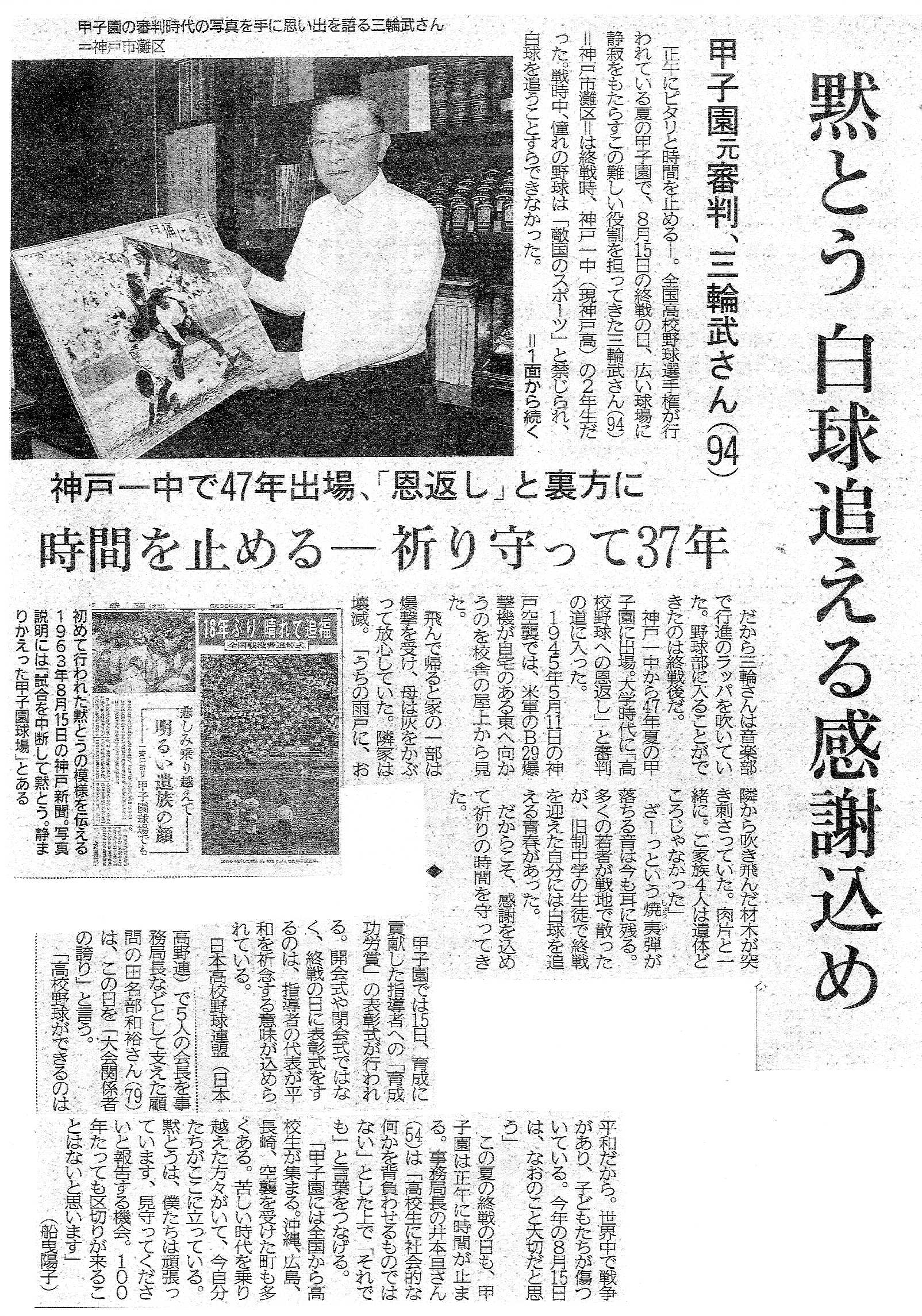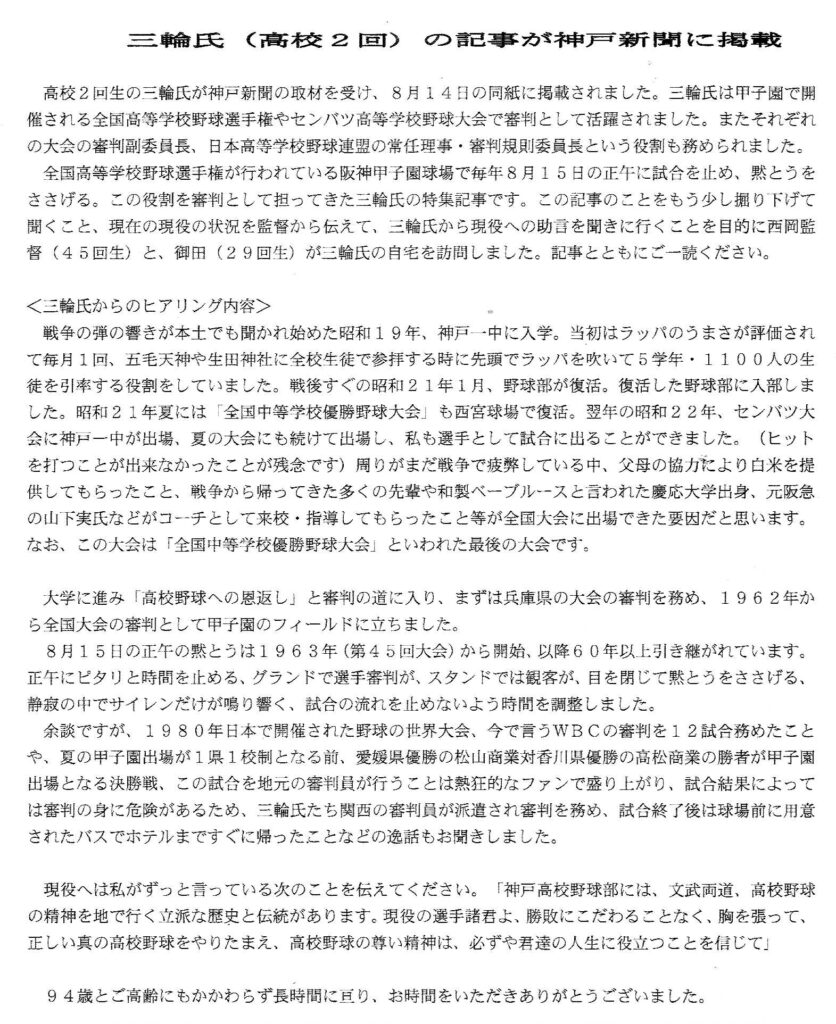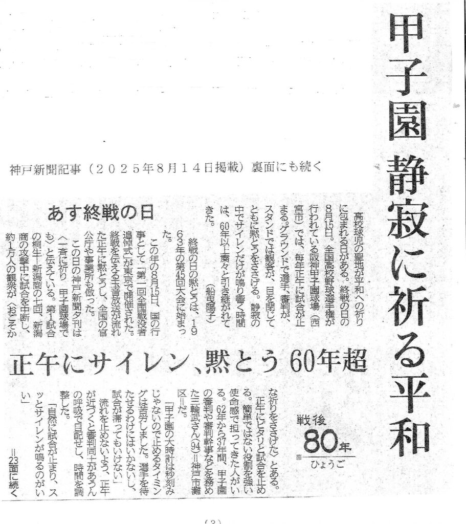 Top>神中神高C 正しい真の高校野球をやりたまえ2026年3月8日 2025年8月14日 神戸新聞三輪武氏(高校2回生)「神戸高校野球部には、文武両道、高校野球の精神を地で行く立派な歴史と伝統があります。現役の選手諸君よ、勝敗にこだわることなく、胸を張って、正しい真の高校野球をやりたまえ、高校野球の尊い精神は、必ずや君達の人生に役立つことを信じて」以上、神戸一中・神戸高校野球クラブ報 2025年12月より、引用。 神中神高CPosted by 中の人