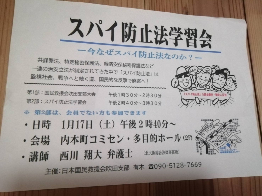 Top>吹田市の平和団体 スパイ防止法学習会1.17吹田2026年1月13日日時:1月17日(土)午後2時40分会場:吹田市 内本町コミュニティセンター 多目的ホール2F 吹田市内本町2丁目2番地12号講師:西川翔大 弁護士主催:日本国民救援会吹田支部 吹田市の平和団体スパイ防止法Posted by 中の人
