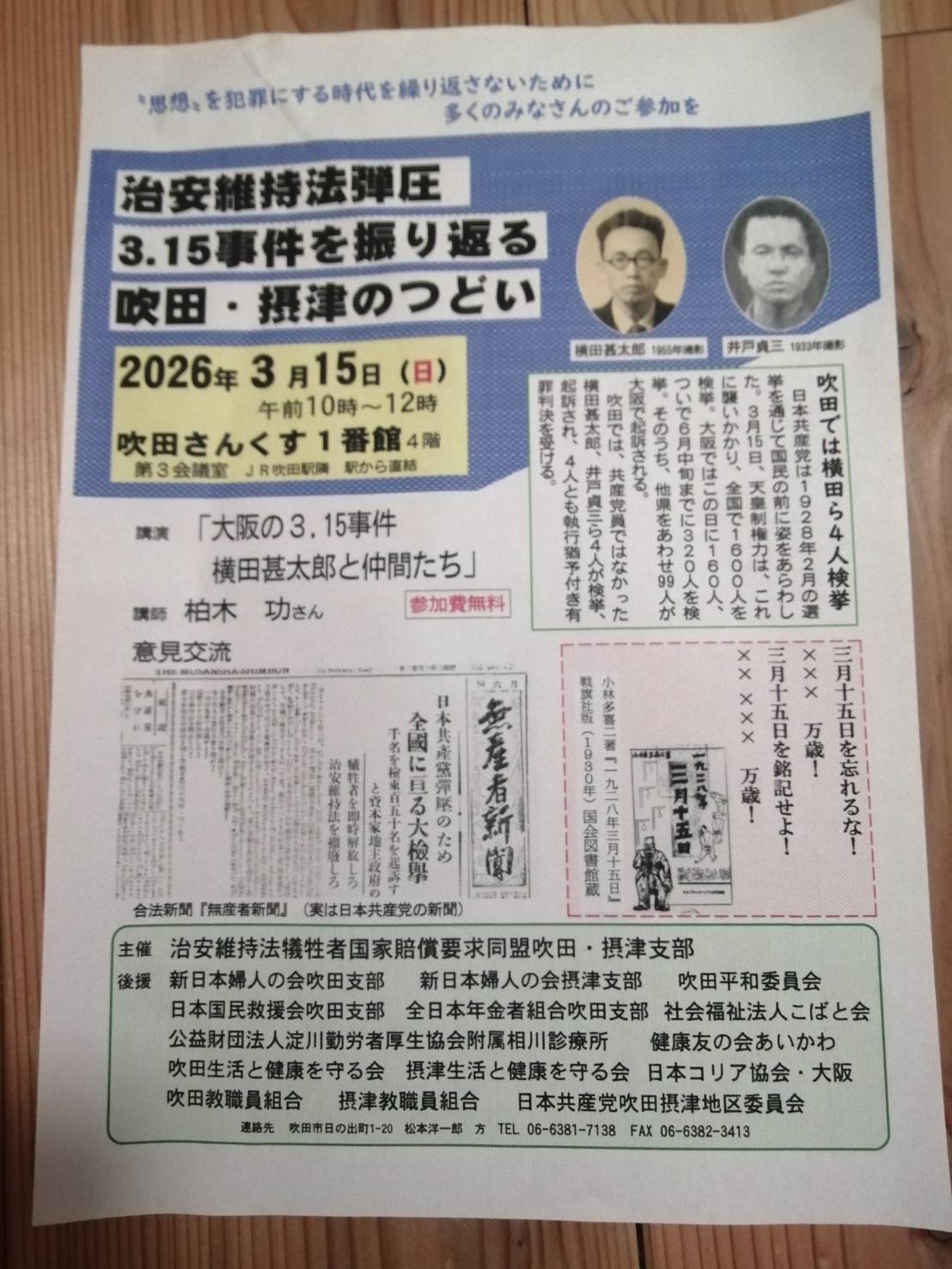 講演「大阪の3.15事件横田甚太郎と仲間たち」